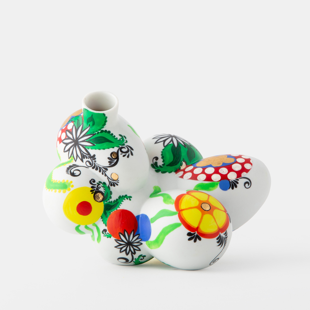 Originally produced by Moooi and designed for Droog Design and porcelain manufacturer Rosenthal, the Egg Vase brings fantastic, contemporary design to the porcelain category. Shaped by hard-boiled eggs stuffed into latex rubber condoms, the collection includes special editions in Black, Gold, Silver and Bronze glazed as well as a decorative Delft Blue design. The Egg Vase Bright joins the iconic family with an uplifting floral design.