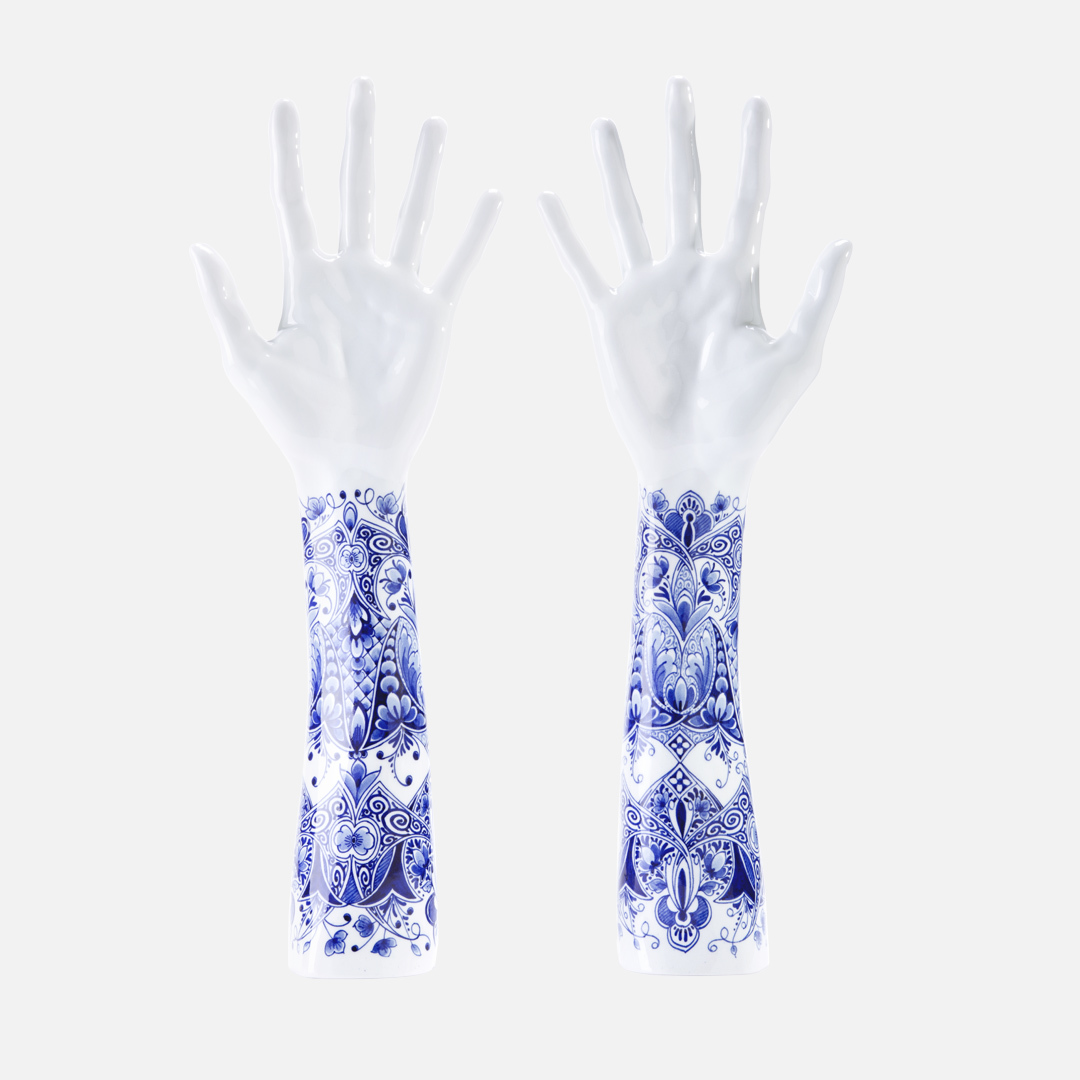 Designed as the hands and arms of world-renown Dutch pianist Iris Hond, this series of porcelain arms are replicas of the pianist’s real arms, created through a process of 3D scanning, prototyping and casting. Each piece and tattoo is hand painted differently in delft blue ink, turning them into limited unique signatures of play, poetry and fantasy.
